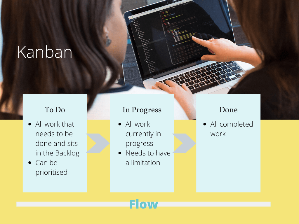 Kanban is a work methodology that focuses on continuous delivery by making use of visualisation and handling bottlenecks rapidly.